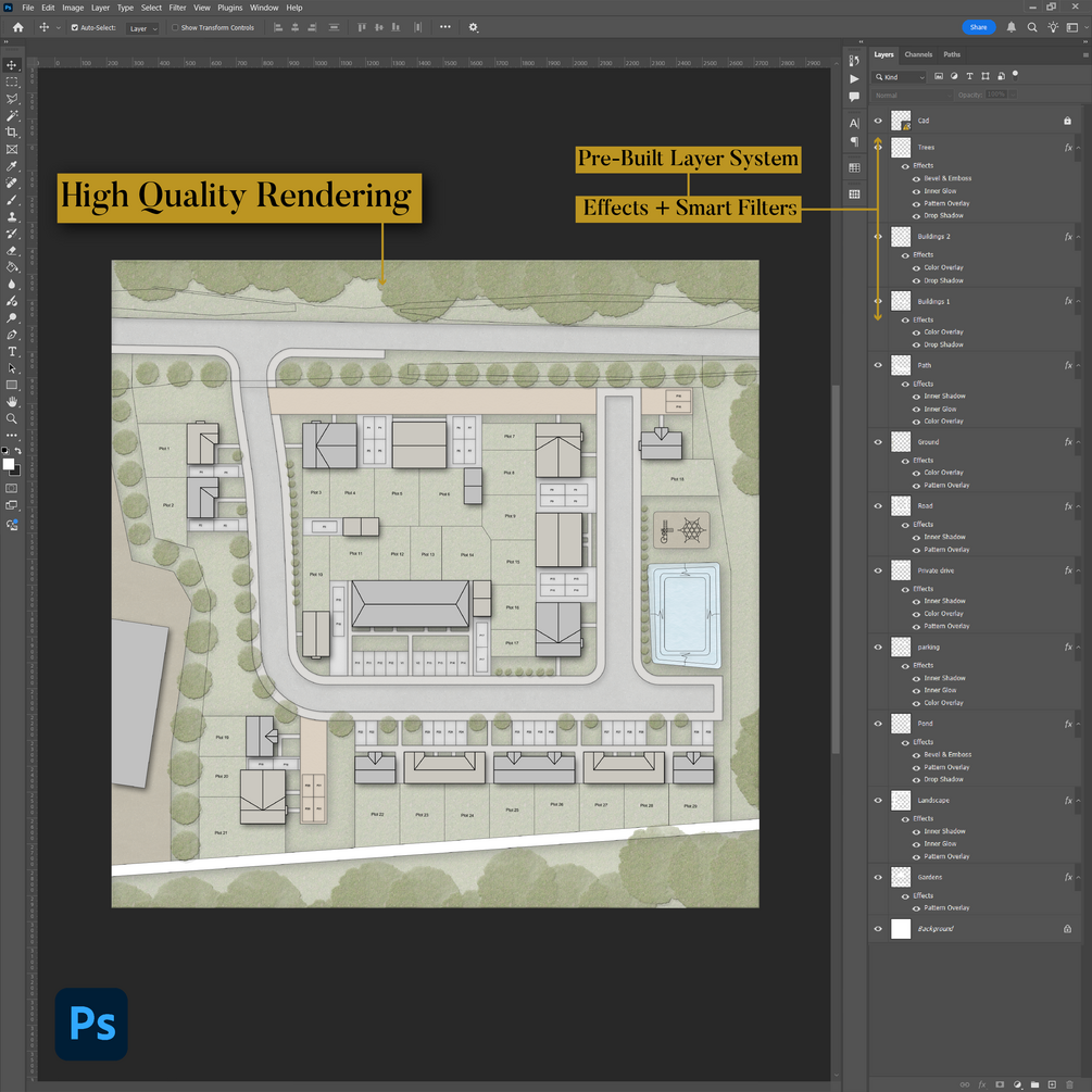 A professional Site Plan Drawing PSD with editable architectural textures, trees, colours, and layered effects, designed for clear, balanced site plan drawings and renderings.