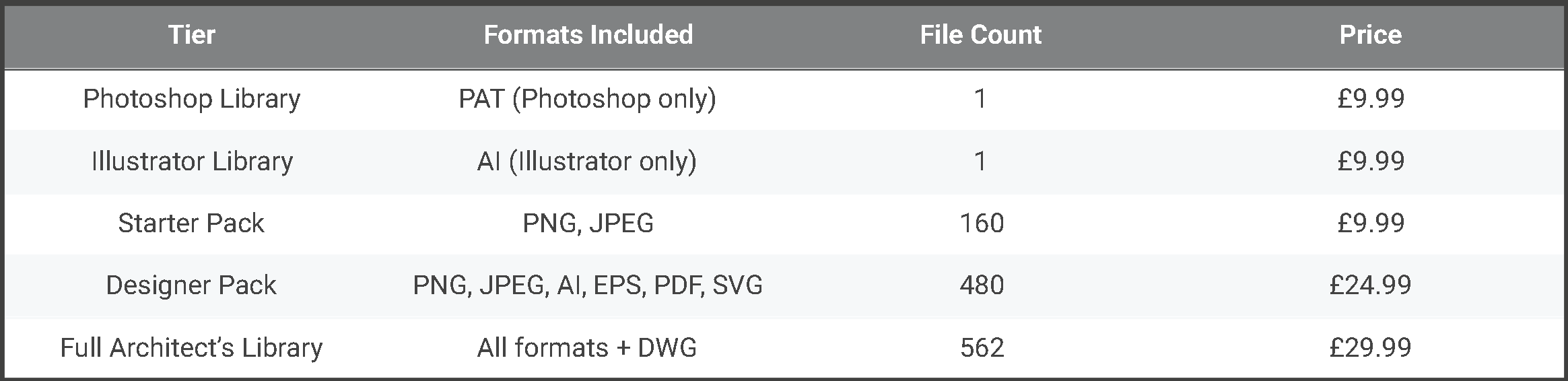 - Full Architect’s Library (£29.99) – (PNG, JPEG, AI, EPS, PDF, SVG, DWG) and libraries. The complete digital toolkit.