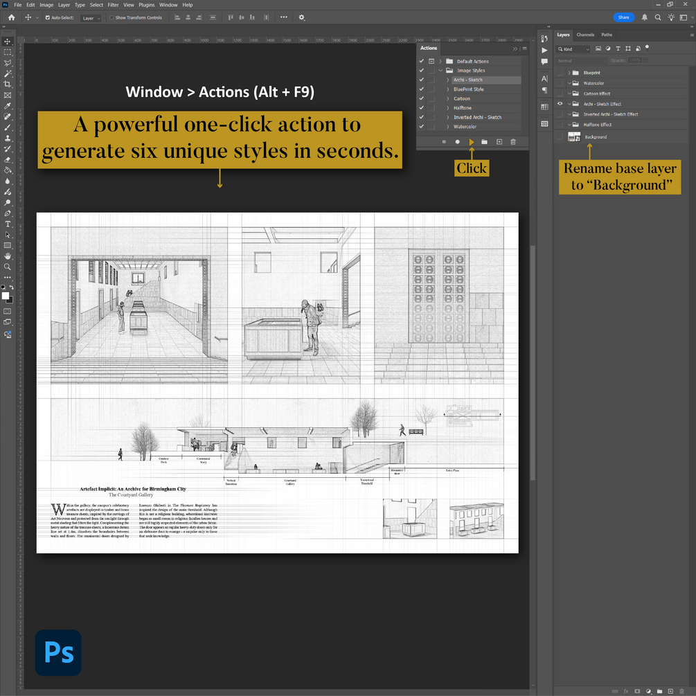 6 One Click Architectural Photoshop Actions is a curated set of Photoshop actions designed for architects, designers, and students who want to transform drawings and renders into clear, expressive visual styles in seconds, without complex setups or endless layer tweaking.